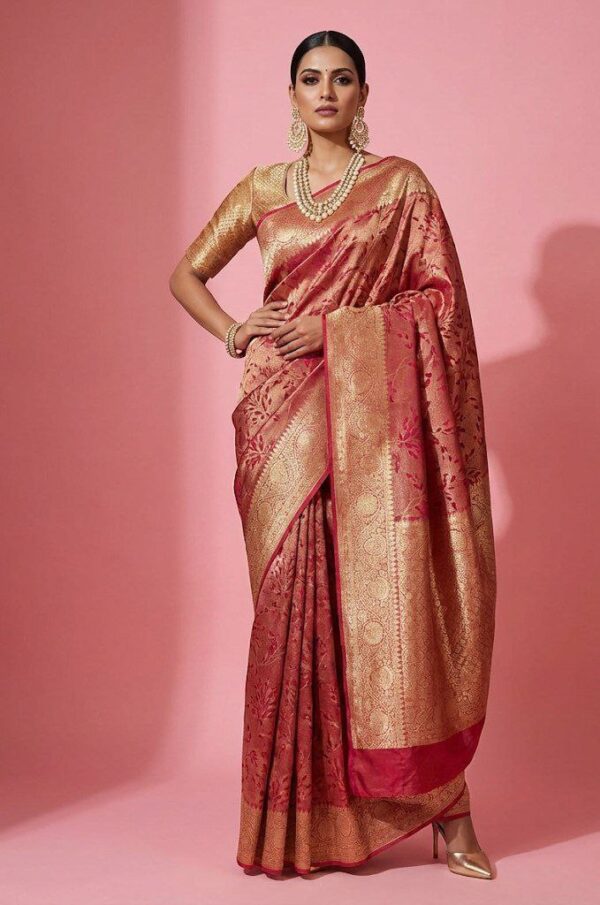 A luxurious rose gold Banarasi silk saree featuring delicate floral weaving and an opulent zari pallu.