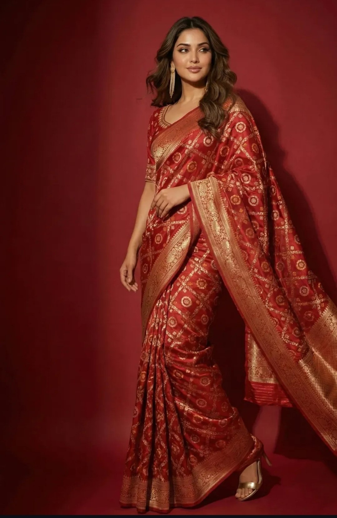 A timeless red Banarasi silk saree featuring traditional gold buti motifs and a richly woven zari border.