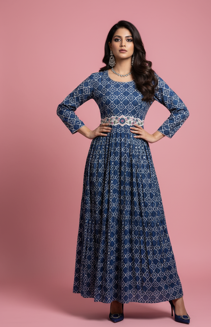 Elegant blue printed maxi dress with ethnic block print motifs
