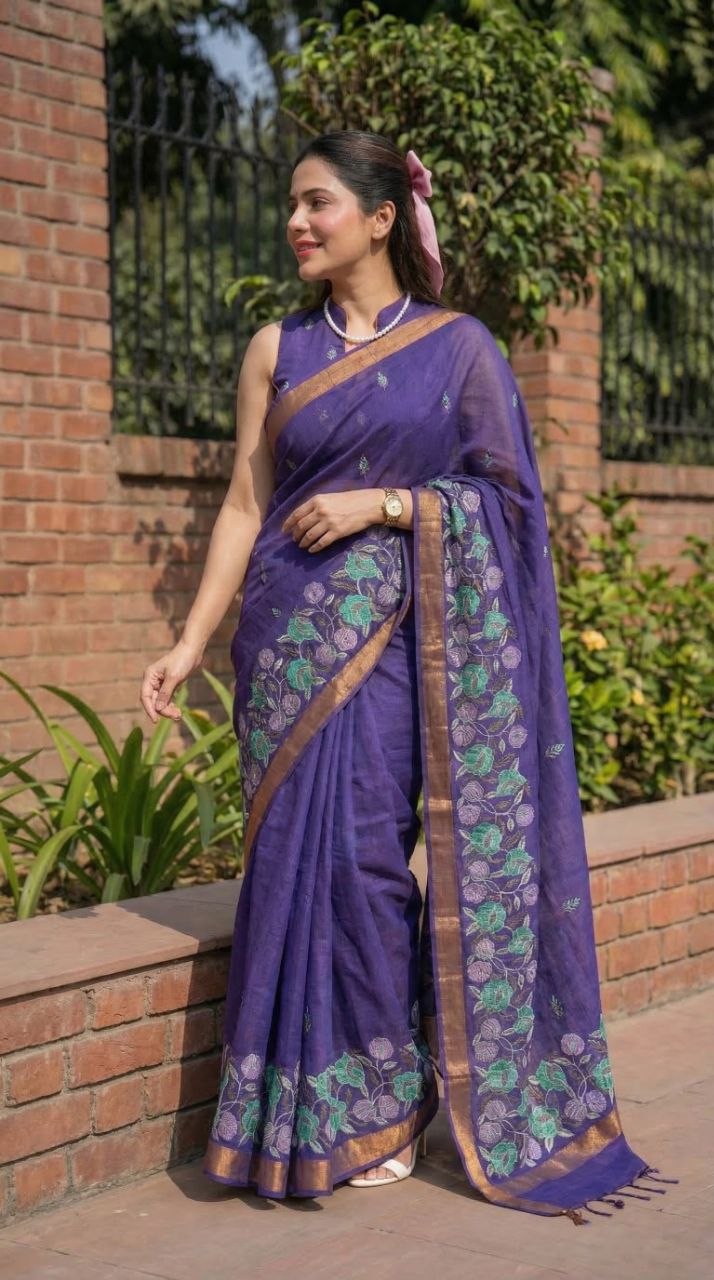 Graceful cotton silk saree with floral embroidery and rich woven border. Soft texture, elegant drape and perfect for festive and occasion wear.