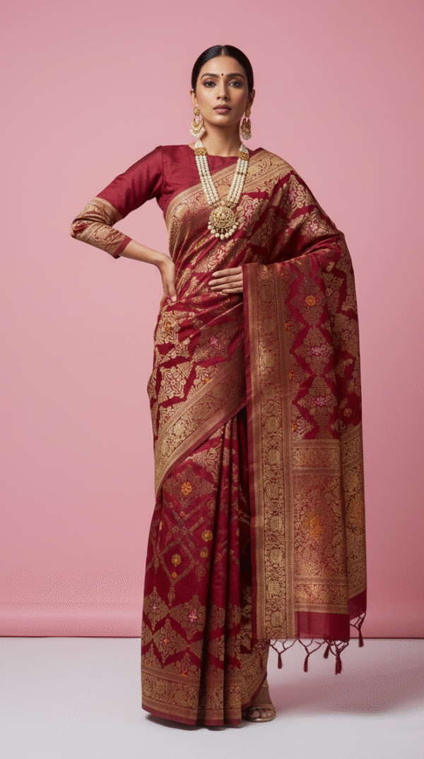 This maroon-red Pure Banarasi saree is a timeless masterpiece, designed with detailed golden zari weaving in floral and geometric patterns. The broad woven border and heritage-style pallu elevate its royal appeal. The combination of maroon and deep red tones makes it an exceptional bridal and festive saree. Pair it with layered temple jewelry for a majestic look.