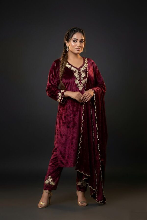 A premium wine velvet embroidered suit set with matching pant and scallop-edge dupatta. Ideal for weddings, winter functions, and festive occasions.