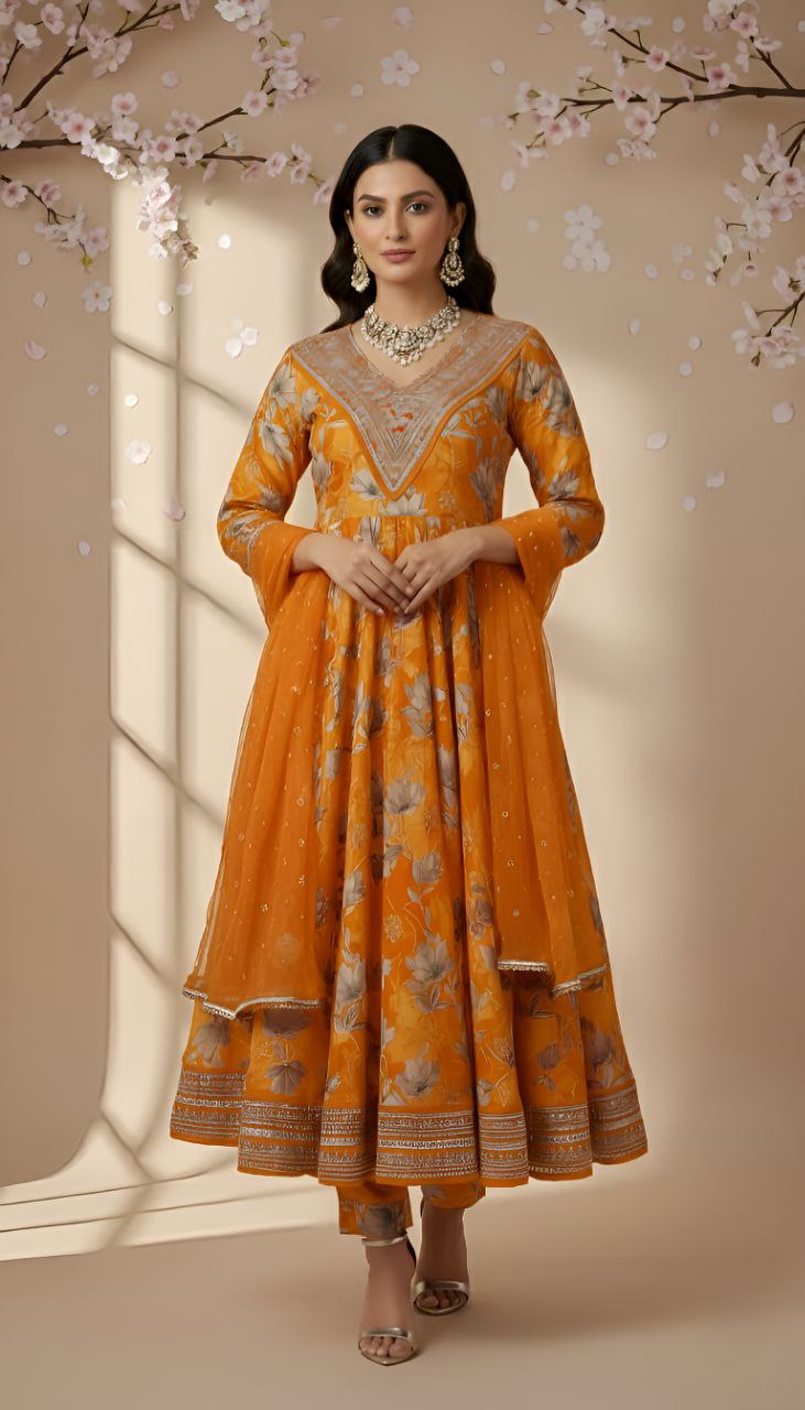 Add festive glow to your wardrobe with this mustard orange floral Anarkali kurta set. The kurta highlights intricate embroidery on the neckline and hem, enhanced by delicate floral prints that elevate its charm. The flowing layered silhouette with full sleeves offers a regal appeal, while the straight pants bring effortless comfort. A lightweight dupatta with subtle embellishments completes the outfit gracefully.