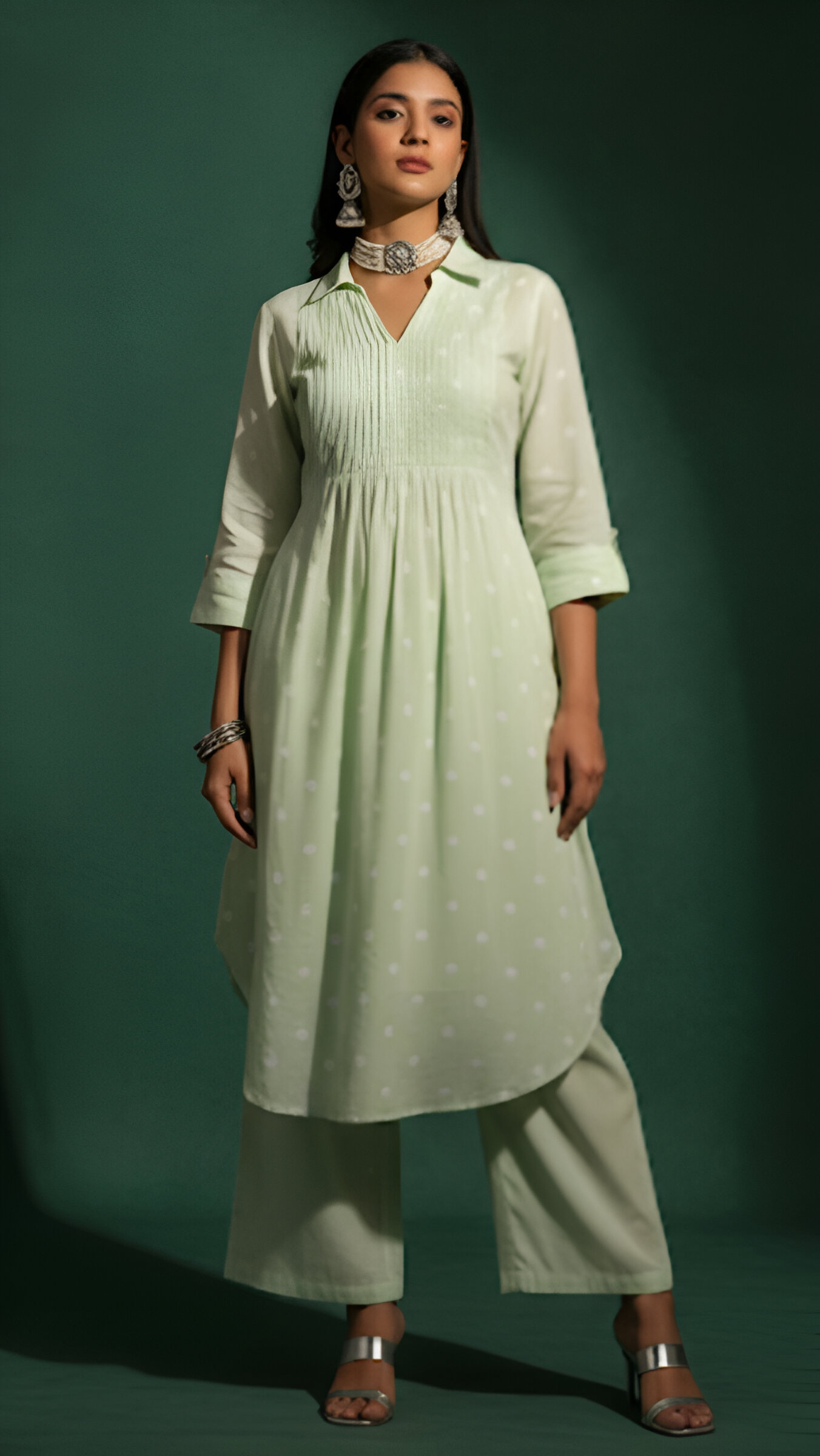 “Shop pastel green polka dot kurta palazzo set. Elegant collared neckline, pleated detailing, and lightweight fabric – perfect for casual and festive wear.”