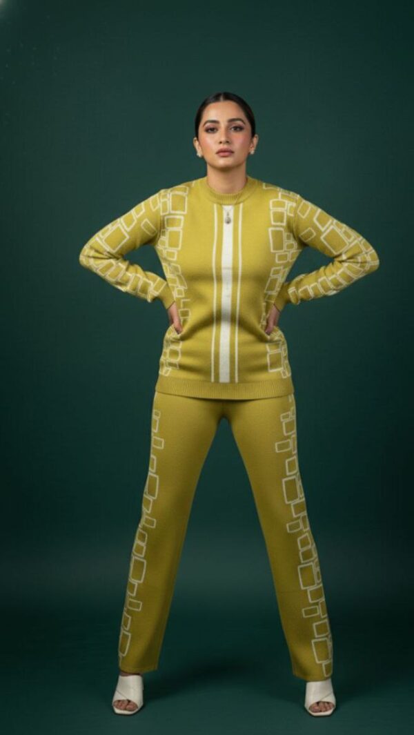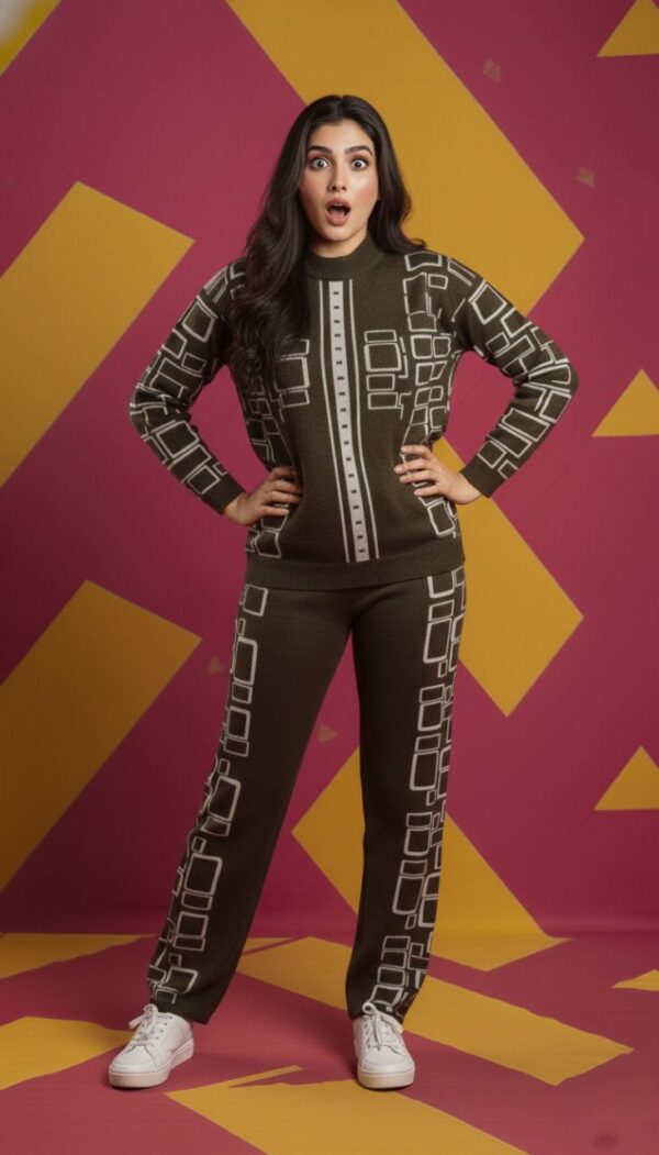 Trendy and comfortable winter knitted co-ord set, designed with a stylish geometric pattern and perfect stretch fit. Available in Black, Coffee Brown & Light Olive Green.