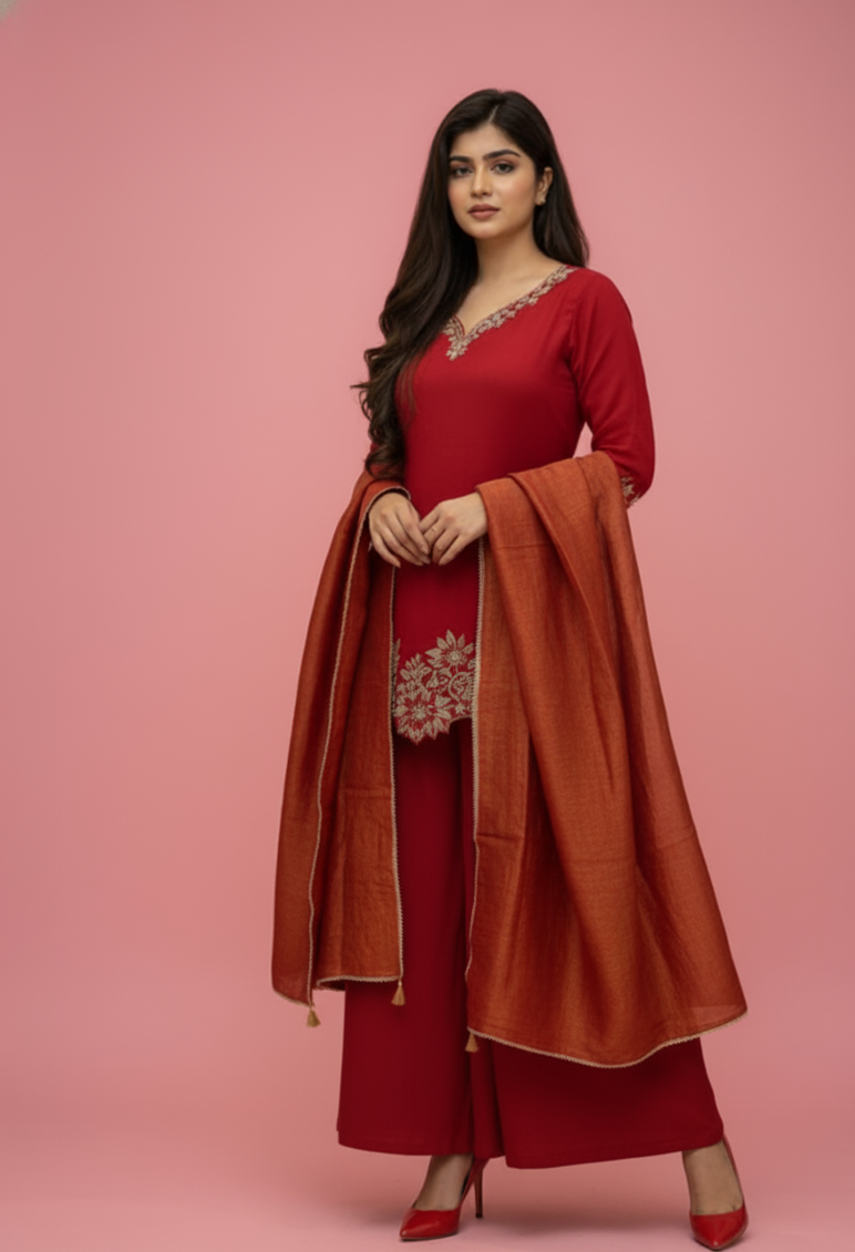 A timeless red embroidered short kurta set paired with sharara and a shimmering copper dupatta — perfect for festive occasions, weddings, or elegant evening gatherings.