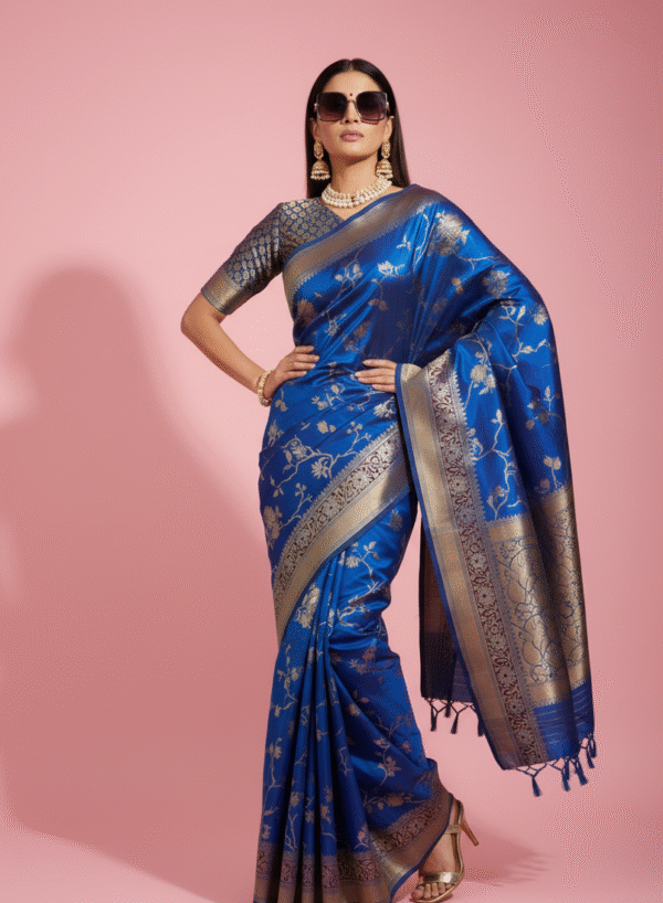 This royal blue Pure Banarasi saree captures the richness of heritage weaving with a modern touch. The saree is adorned with delicate silver zari floral patterns across the body, complemented by a broad zari border and intricately designed pallu. The deep blue base enhances the shimmering zari work, making it ideal for weddings, festive celebrations, and grand occasions. Pair it with statement jewelry to complete the regal look.